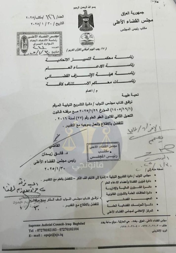رئيس مجلس القضاء الأعلى يوجه المحاكم للعمل بموجبه كونه اصبح نافذ من تاريخ التصويت عليه.