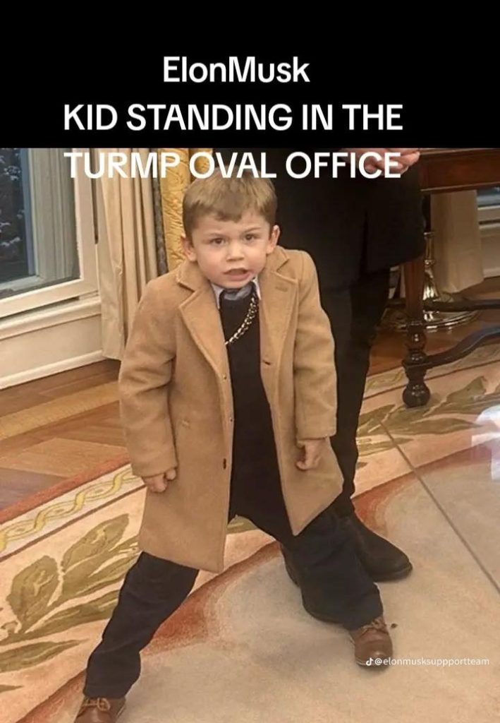 ولم تمض بضعة سويعات حتى تسلل الطفل ( X ) البالغ من العمر 4 سنوات، وهو ابن الملياردير الأمريكي إيلون ماسك، فخطف الأنظار في مكتب ترامبود، شكّل ظهوره في المؤتمر الصحفي مادة جدلية داخل الولايات المتحدة وخارجها، فقد طلب من ترامبود السكوت، قال له: اخرس – انت ليس الرئيس، وعليك الرحيل – غير مسموح لك بالكلام. ثم لعب الطفل ( X ) بأنفه ومسح يده على سطح المكتب البيضاوي، وما إلى ذلك من الحركات التي فسرها البعض علامة شؤم تنذر بزوال سلطته. .